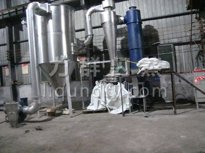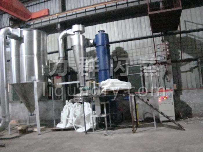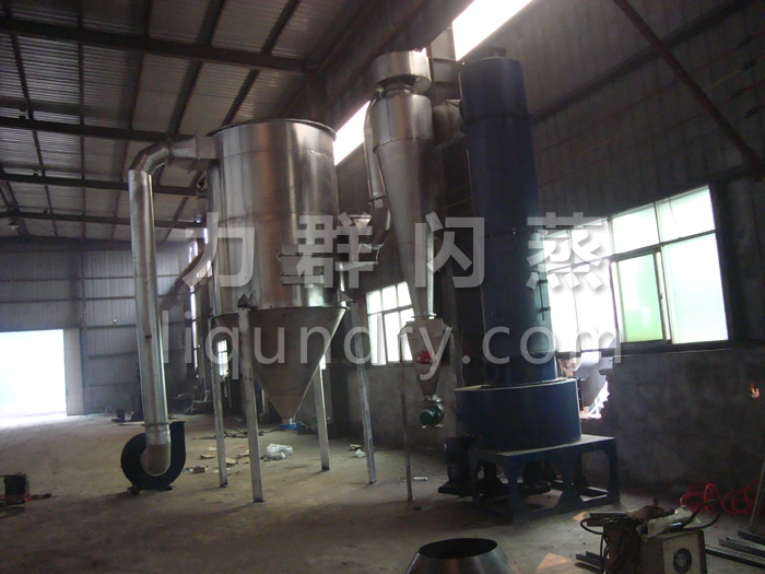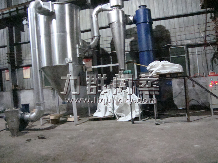 2、工作原理: 經換熱器加熱后的潔凈空氣被鼓入進風口,以適宜的速度旋入干燥室底部的環隙,然后按切線方向進入干燥室,并呈螺旋狀上升:同時,物料則由可無級調速的加料器定量加入塔內。在干燥塔內,物料與熱空氣進行充分、高效的質熱變換,被干燥的粉狀物料隨同熱風一起輸送至分離器,其中成品收集包裝,而尾氣則進一步經除塵裝置處理后排空。