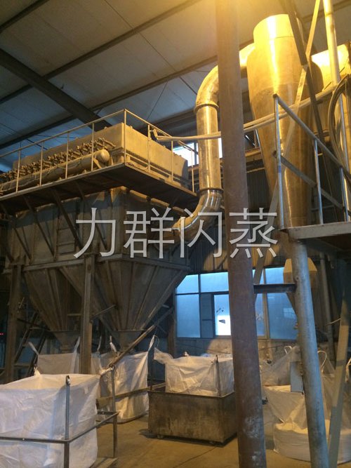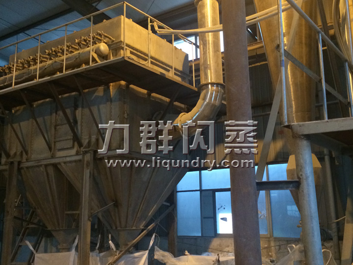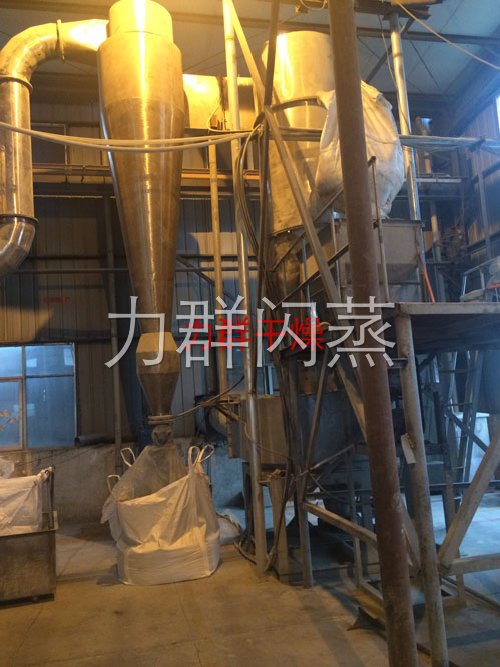 經換熱器加熱后的潔凈空氣被鼓入進風口,以適宜的速度旋入干燥室底部的環隙,然后按切線方向進入干燥室,并呈螺旋狀上升:同時,物料則由可無級調速的加料器定量加入塔內。在干燥塔內,物料與熱空氣進行充分、高效的質熱變換,被干燥的粉狀物料隨同熱風一起輸送至分離器,其中成品收集包裝,而尾氣則進一步經除塵裝置處理后排空。